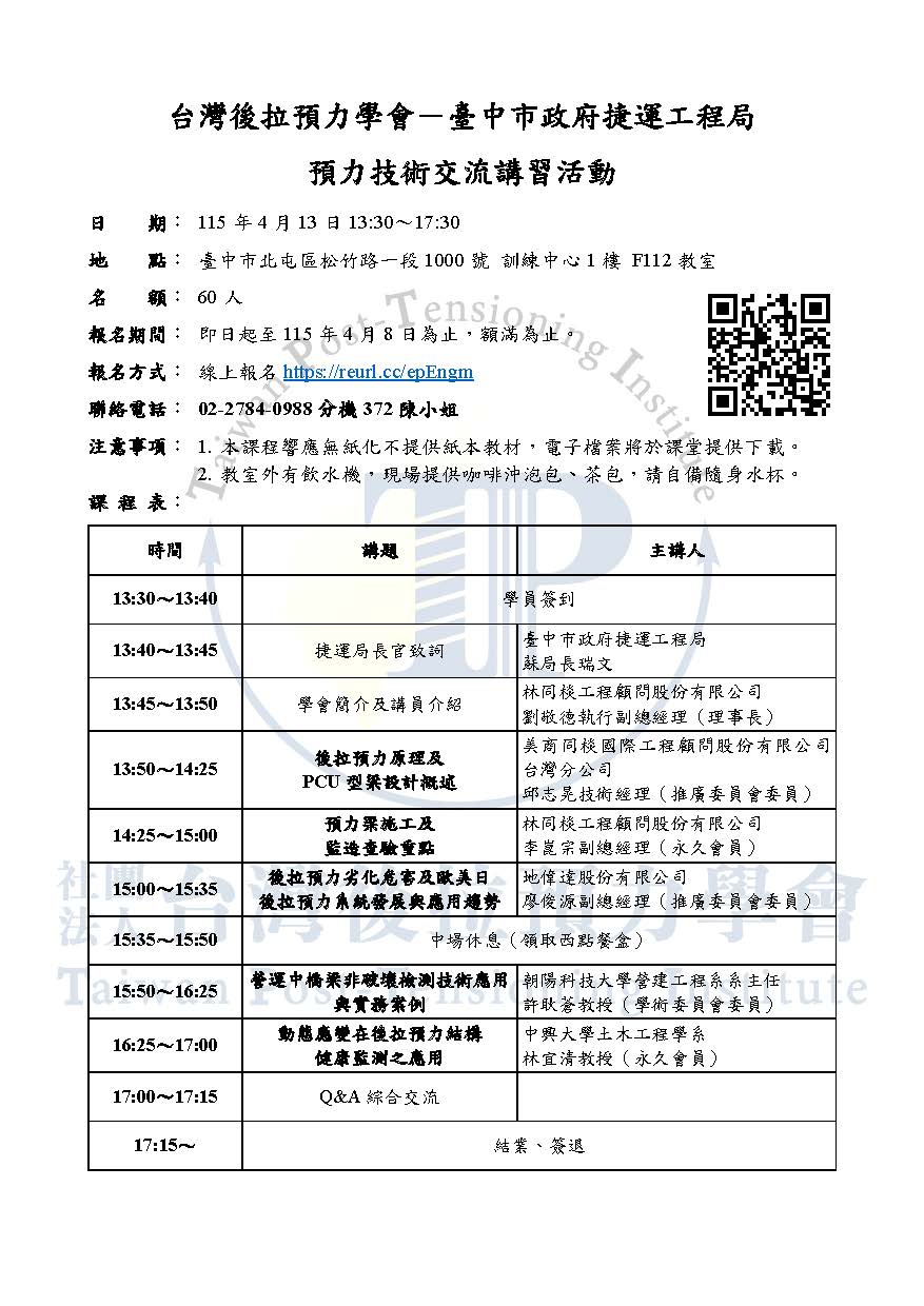 台灣後拉預力學會-臺中市政府捷運工程局 預力技術交流講習活動